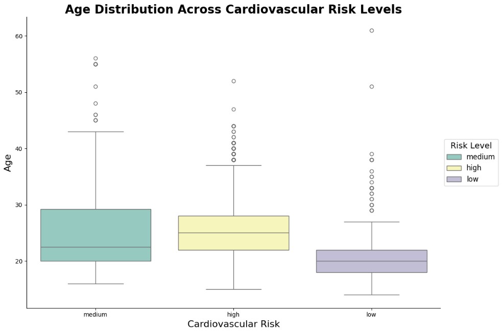 In contrast, the medium-risk category exhibits a wider age distribution, with the median age slightly higher than that of the low-risk group. The presence of several outliers, along with the broader spread, suggests greater diversity in age among individuals in this category.