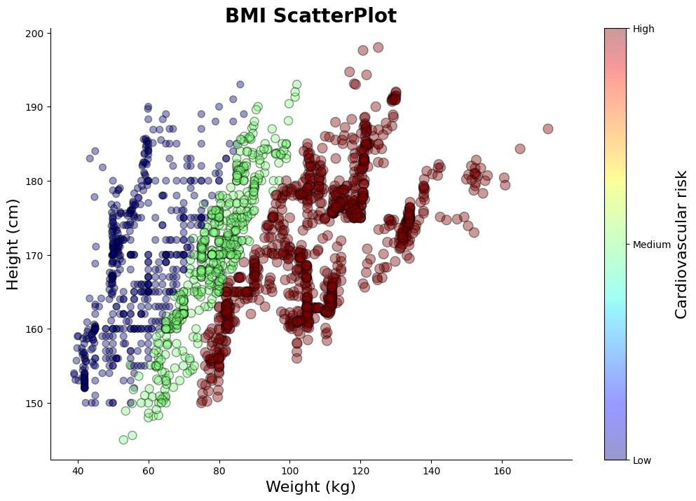 The scatter graph reveals a positive correlation between BMI and cardiovascular risk. Individuals with lower BMI tend to exhibit lower risk levels for cardiovascular diseases, whereas those with higher BMI appear to face elevated risk.