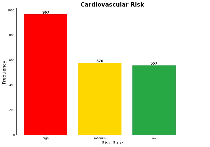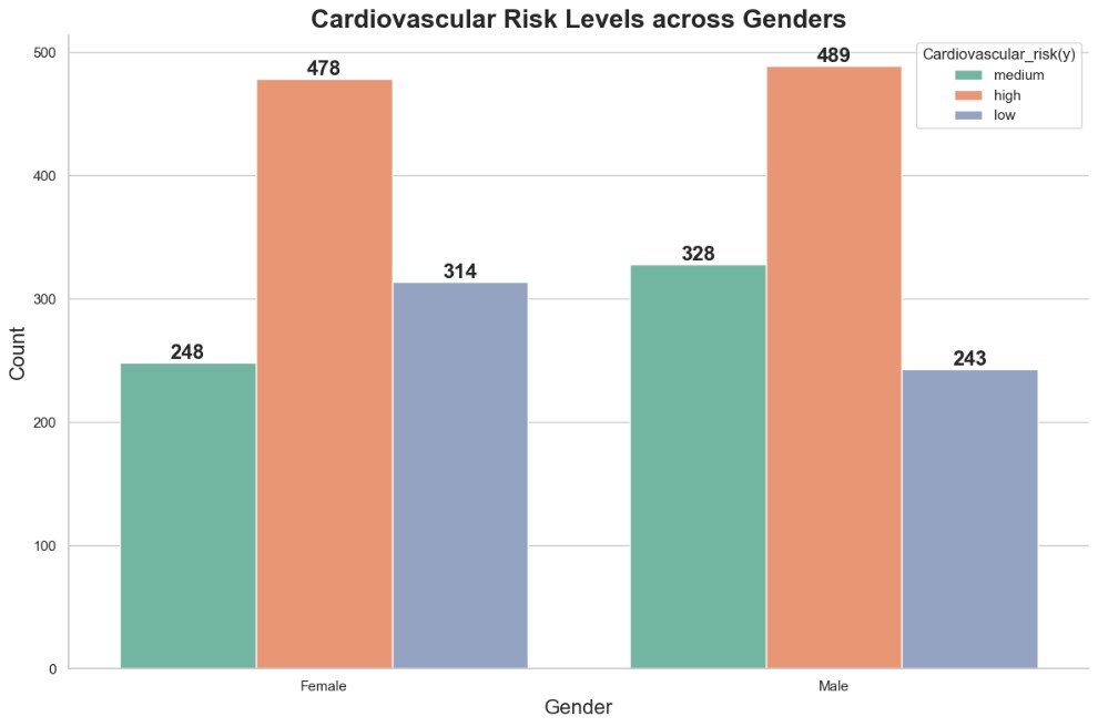 The graph indicates that the distribution of cardiovascular risk between the two genders is relatively even. Both females and males show the highest count in the high-risk category, with each reaching 500, suggesting that high cardiovascular risk is prevalent across both genders. However, the number of individuals in the medium-risk category is higher among males compared to females. Additionally, fewer males fall into the low-risk category than females.