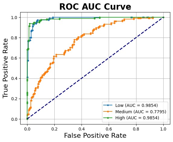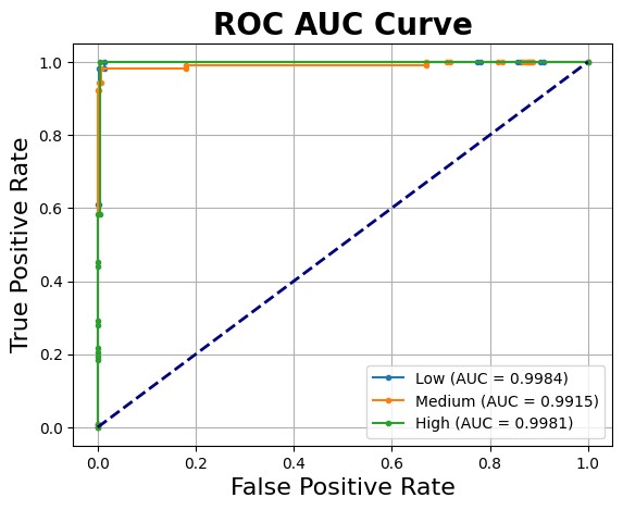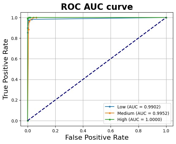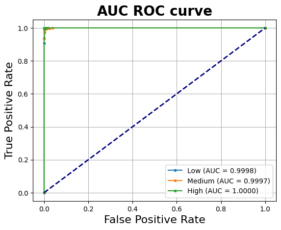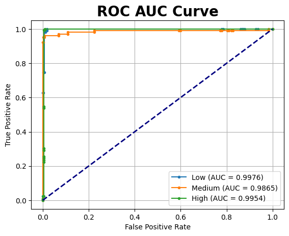 The ROC AUC curve demonstrates nearly perfect discrimination between the risk levels. The AUC values for low, medium, and high risk are 0.9992, 0.9990, and 1.0000, respectively. These near-ideal scores suggest excellent excellent predictive capabilities, with minimal false positives and high true positive rates across all classes.
