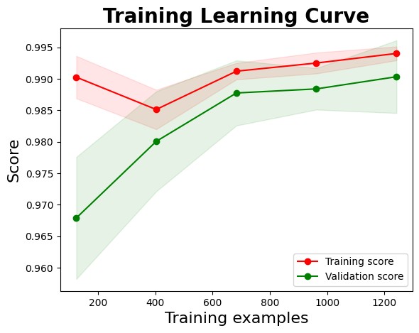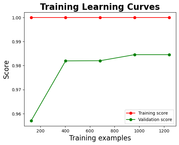 The training score consistently remains at 1.0 across all sample size, while the validation score exhibits variation, reflecting the model’s fluctuating generalisation performance. Additionally, the absence of a shaded region between the training and validation learning curves suggests a minimal generalisation gap. Although this may seem encouraging, it could also indicate that the validation performance plateaus prematurely, possibly due to limitations in sample diversity or insufficient complexity in unseen cases.