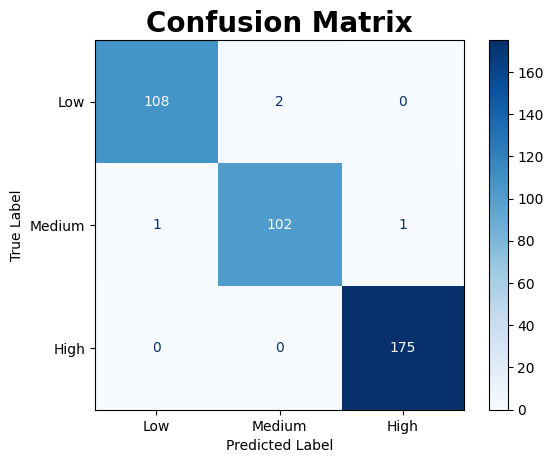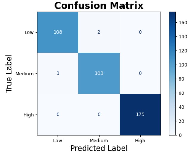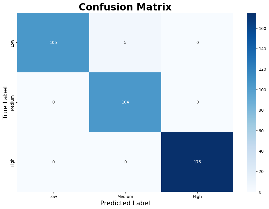 The confusion matrix for the test data shows that the model performs very well, albeit not perfectly, when applied to new samples. Specifically, 108 instances of low risk were correctly classified, with 2 misclassified as Medium and none as High. For the medium risk category, 103 instances were correctly predicted, while 1 low-risk instance misclassified. In the high-risk category, the model achieved perfect classification, correctly identifying all 175 instances with no misclassifications. While minor error exists in the low and medium categories, the overall performance remains robust.